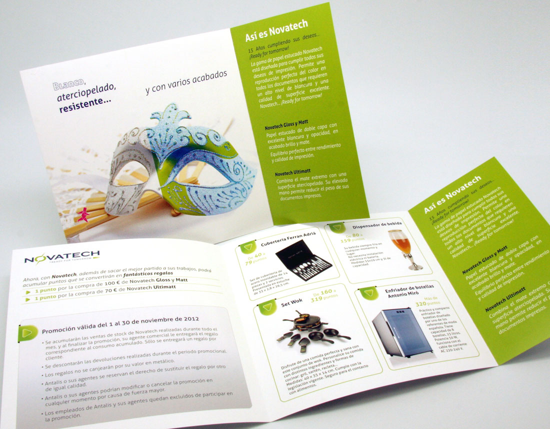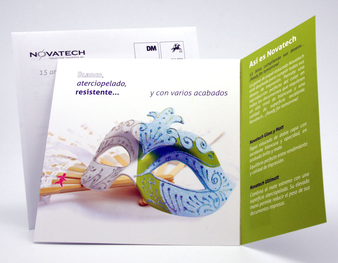 El objetivo de este folleto era destacar las características de blancura, suavidad, resistencia y diferentes acabados que ofrece la gama de papeles Novatech.